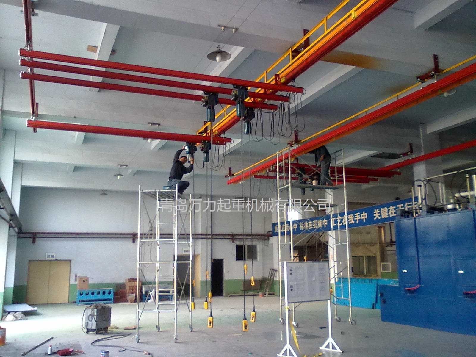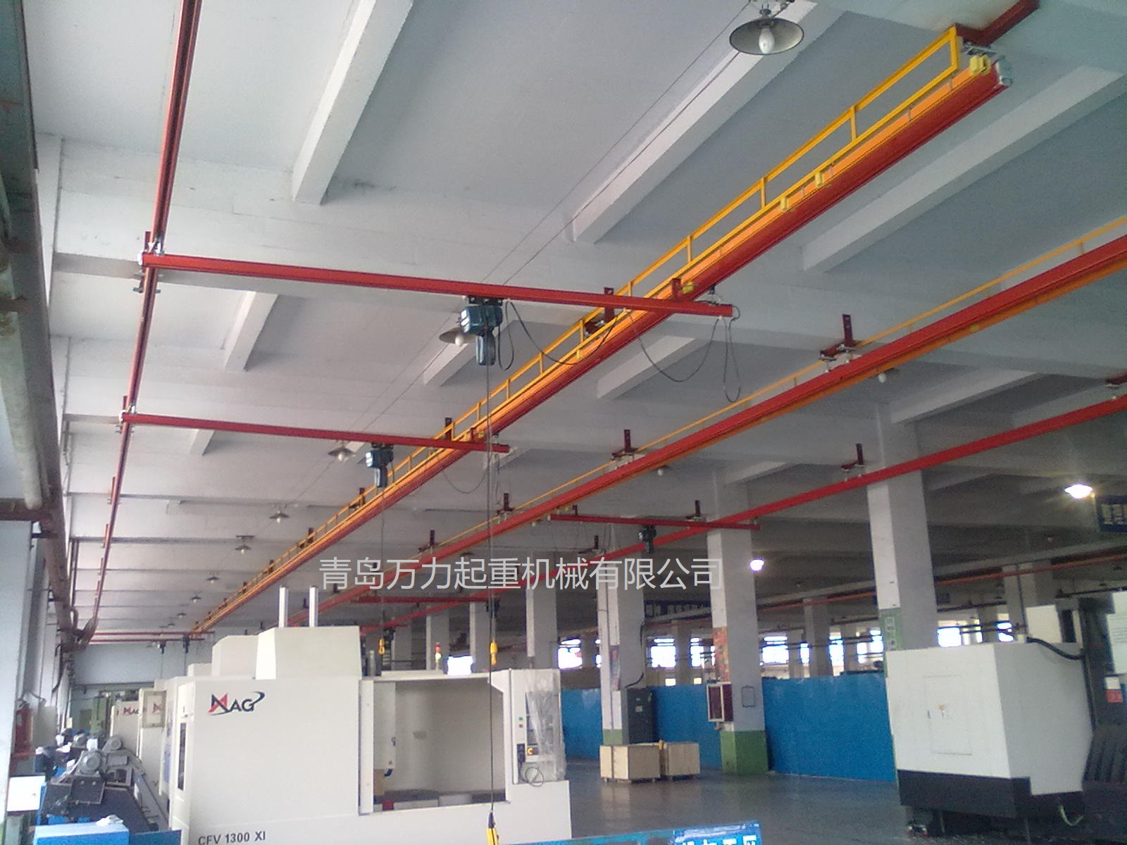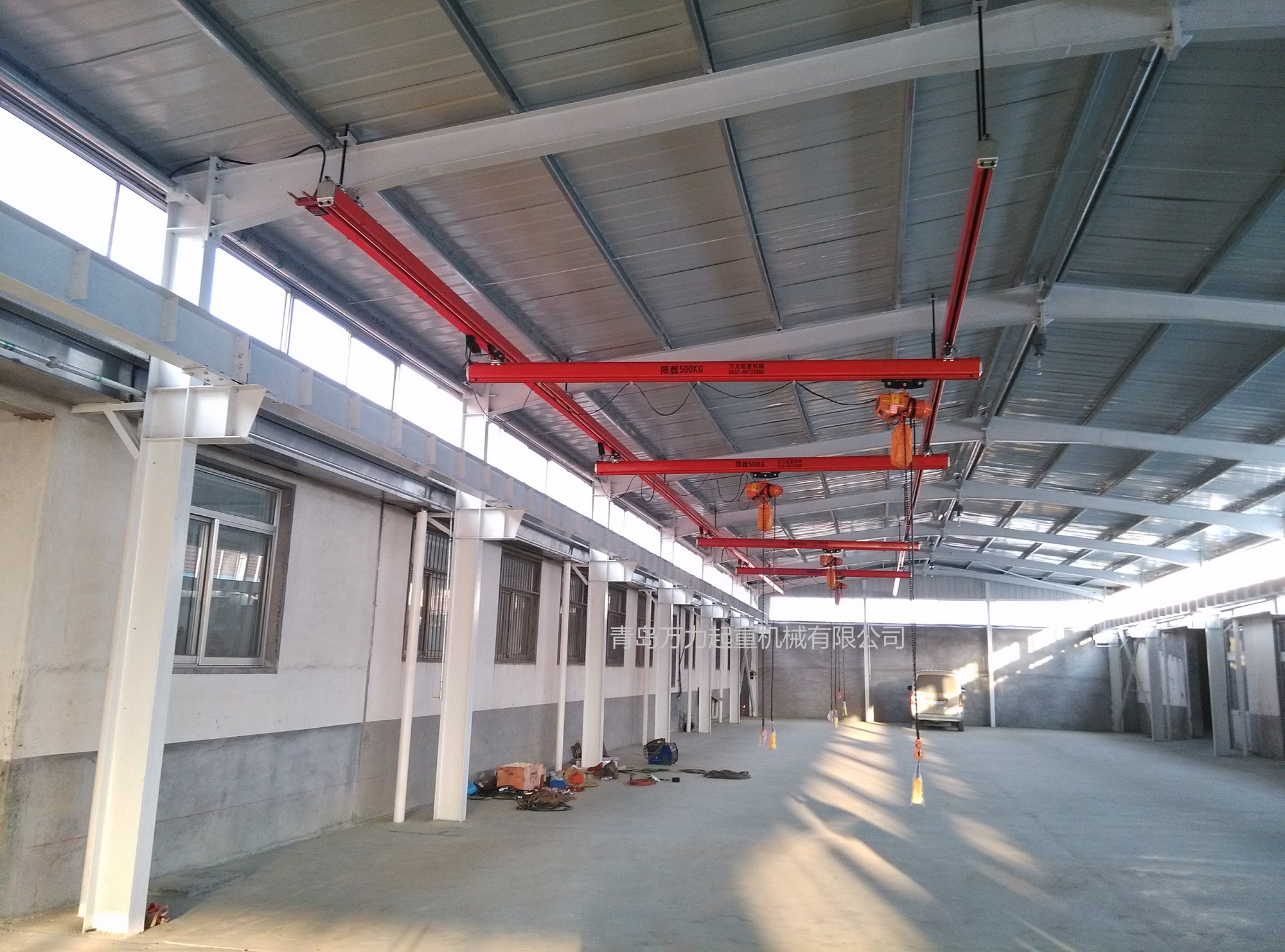 KBK,為Kombiniert Kran的縮寫,意為組合式起重機(jī)。主要由軌道、懸掛裝置、行走小車和一些功能組件構(gòu)成,所有模塊都為標(biāo)準(zhǔn)組件。起升裝置主要采用環(huán)鏈電動(dòng)葫蘆,也可吊掛一些機(jī)械手或焊槍之類,作為工具滑軌使用。起重量一般為125kg-2000kg。KBK軌道-采用Ω形狀,2片焊接而成。常用的是KBKII型軌道,多根軌道可用高強(qiáng)度螺栓連接。彎軌的轉(zhuǎn)彎半徑1.5m,大彎可用直軌搭配。沒有更小半徑的,會(huì)對(duì)小車運(yùn)行有影響。(KBKI型軌道轉(zhuǎn)彎半徑1m,在此不做介紹)。也可在KBKII型軌道內(nèi)側(cè)安裝內(nèi)置滑觸線,用于葫蘆供電,稱為KBKII-R型。懸掛裝置一般可以安裝在工字鋼/H型鋼下緣,有一定自鎖功能,安裝簡便牢靠。功能組件包括:道岔,十字轉(zhuǎn)盤,升降段等。KBK組合起重機(jī)包括-單軌起重機(jī)、-單梁起重機(jī)、-雙梁起重機(jī)、-伸縮梁、-堆垛機(jī)等各種型式的起重設(shè)備,起重量0.125t~2t適應(yīng)范圍極廣,尤其適用于現(xiàn)代化生產(chǎn)輸送線,其特點(diǎn)概述如下: 1、可靠性好、穩(wěn)定性高 KBK輕型起重機(jī)系統(tǒng)的組成部件全部是標(biāo)準(zhǔn)模塊,可以保證大批量、高質(zhì)量生產(chǎn),因而系統(tǒng)十分可靠;系統(tǒng)模塊的主體是三種規(guī)格的冷軋型材,強(qiáng)度大,剛度好,自重輕,保證了系統(tǒng)的穩(wěn)定性。 2、適應(yīng)能力強(qiáng) KBK系統(tǒng)可根據(jù)工廠各工位的需要,靈活地設(shè)計(jì)安裝起重機(jī)系統(tǒng),從定點(diǎn)運(yùn)送到高準(zhǔn)確度地多點(diǎn)、多節(jié)拍的自動(dòng)化輸送線,都能隨意組合而成??捎糜谛略O(shè)計(jì)的廠房,也可用于舊系統(tǒng)的改造或延伸。3、安裝方便,經(jīng)濟(jì)高效 KBK系統(tǒng)的安裝調(diào)試很方便,型材及各標(biāo)準(zhǔn)模塊之間只須用螺栓連接即可使用,可節(jié)省工廠的空間和面積,大大減少了人力資源,提高生產(chǎn)效率,從而降低能耗,提高企業(yè)效益。系統(tǒng)可以手動(dòng)操作,也可以實(shí)現(xiàn)自動(dòng)、半自動(dòng)操作,運(yùn)行高效。
