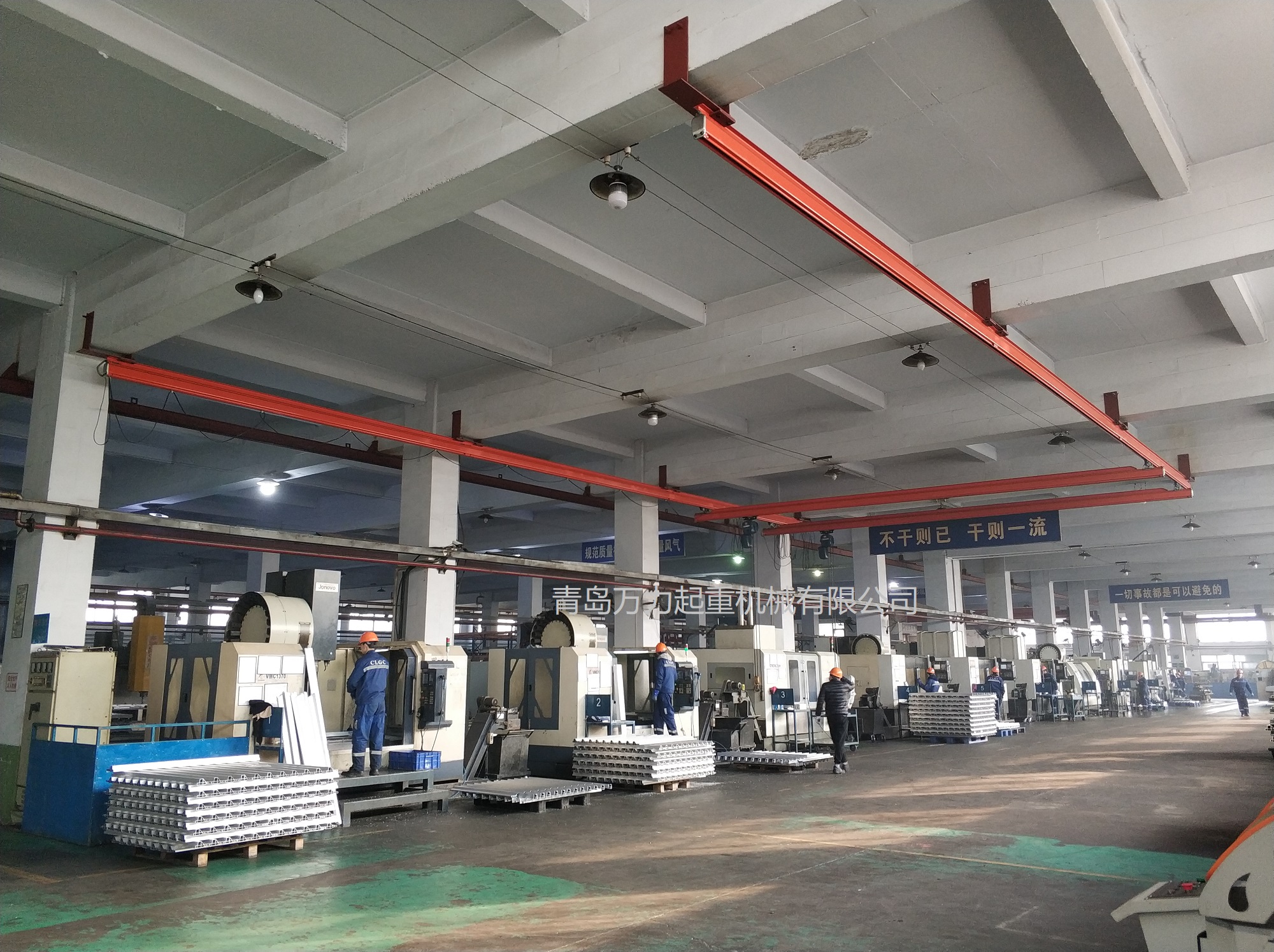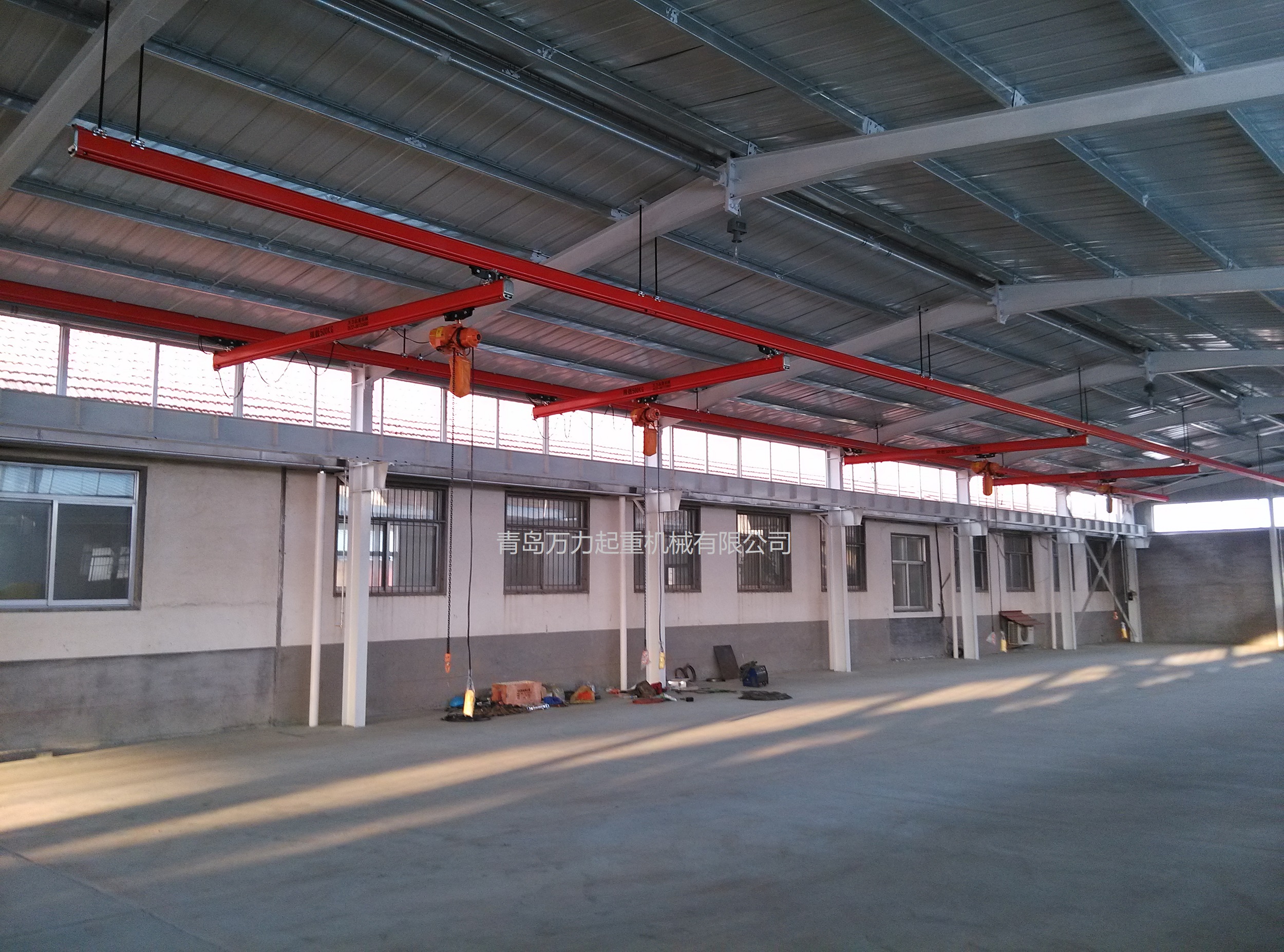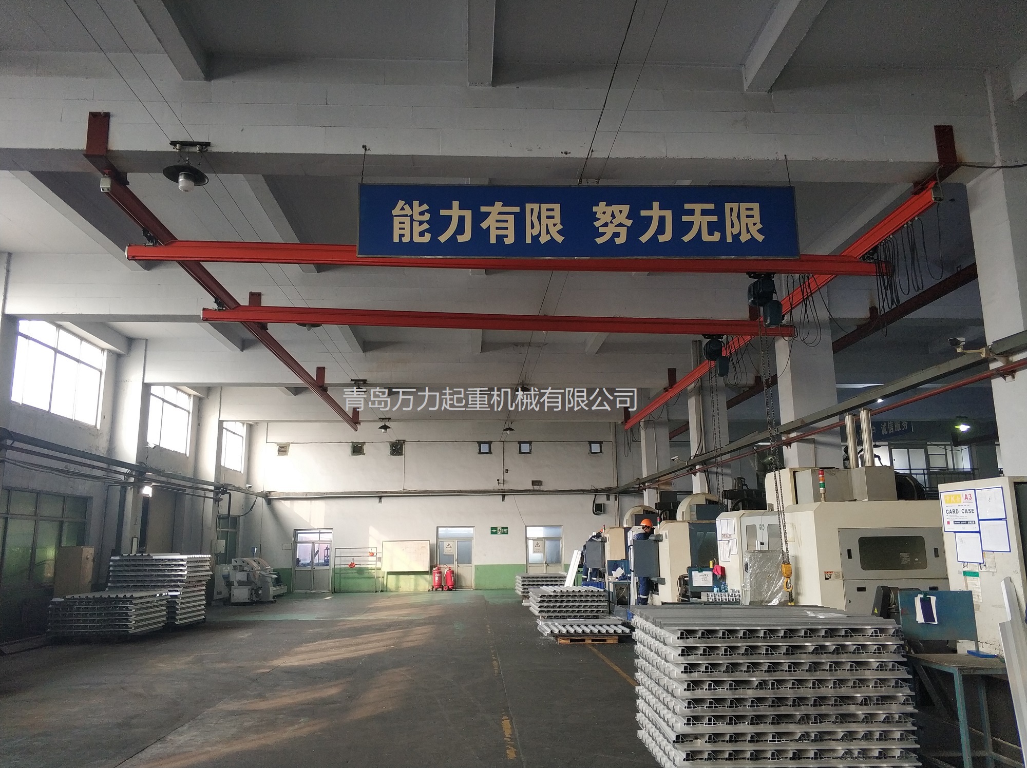 KBK,為Kombiniert Kran的縮寫,意為組合式起重機(jī)。主要由軌道、懸掛裝置、行走小車和一些功能組件構(gòu)成,所有模塊都為標(biāo)準(zhǔn)組件。起升裝置主要采用環(huán)鏈電動(dòng)葫蘆,也可吊掛一些機(jī)械手或焊槍之類,作為工具滑軌使用。起重量一般為125kg-2000kg。KBK軌道-采用Ω形狀,2片焊接而成。常用的是KBKII型軌道,多根軌道可用高強(qiáng)度螺栓連接。彎軌的轉(zhuǎn)彎半徑1.5m,大彎可用直軌搭配。沒有更小半徑的,會(huì)對(duì)小車運(yùn)行有影響。(KBKI型軌道轉(zhuǎn)彎半徑1m,在此不做介紹)。也可在KBKII型軌道內(nèi)側(cè)安裝內(nèi)置滑觸線,用于葫蘆供電,稱為KBKII-R型。懸掛裝置一般可以安裝在工字鋼/H型鋼下緣,有一定自鎖功能,安裝簡便牢靠。功能組件包括:道岔,十字轉(zhuǎn)盤,升降段等。KBK組合起重機(jī)包括-單軌起重機(jī)、-單梁起重機(jī)、-雙梁起重機(jī)、-伸縮梁、-堆垛機(jī)等各種型式的起重設(shè)備,起重量0.125t~2t適應(yīng)范圍極廣,尤其適用于現(xiàn)代化生產(chǎn)輸送線,其特點(diǎn)概述如下: 1、可靠性好、穩(wěn)定性高 KBK輕型起重機(jī)系統(tǒng)的組成部件全部是標(biāo)準(zhǔn)模塊,可以保證大批量、高質(zhì)量生產(chǎn),因而系統(tǒng)十分可靠;系統(tǒng)模塊的主體是三種規(guī)格的冷軋型材,強(qiáng)度大,剛度好,自重輕,保證了系統(tǒng)的穩(wěn)定性。 2、適應(yīng)能力強(qiáng) KBK系統(tǒng)可根據(jù)工廠各工位的需要,靈活地設(shè)計(jì)安裝起重機(jī)系統(tǒng),從定點(diǎn)運(yùn)送到高準(zhǔn)確度地多點(diǎn)、多節(jié)拍的自動(dòng)化輸送線,都能隨意組合而成??捎糜谛略O(shè)計(jì)的廠房,也可用于舊系統(tǒng)的改造或延伸。3、安裝方便,經(jīng)濟(jì)高效 KBK系統(tǒng)的安裝調(diào)試很方便,型材及各標(biāo)準(zhǔn)模塊之間只須用螺栓連接即可使用,可節(jié)省工廠的空間和面積,大大減少了人力資源,提高生產(chǎn)效率,從而降低能耗,提高企業(yè)效益。系統(tǒng)可以手動(dòng)操作,也可以實(shí)現(xiàn)自動(dòng)、半自動(dòng)操作,運(yùn)行高效。