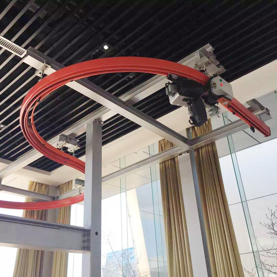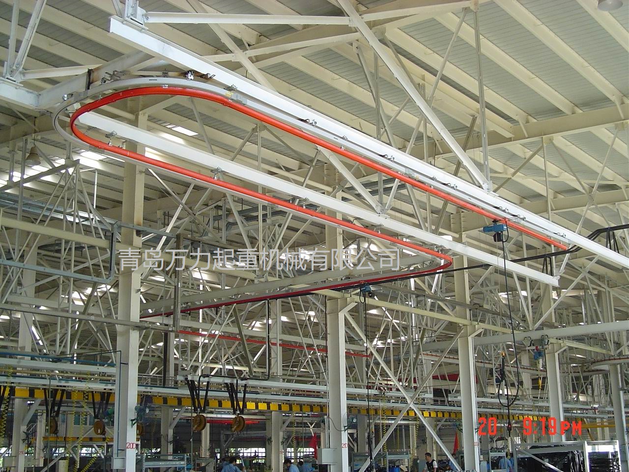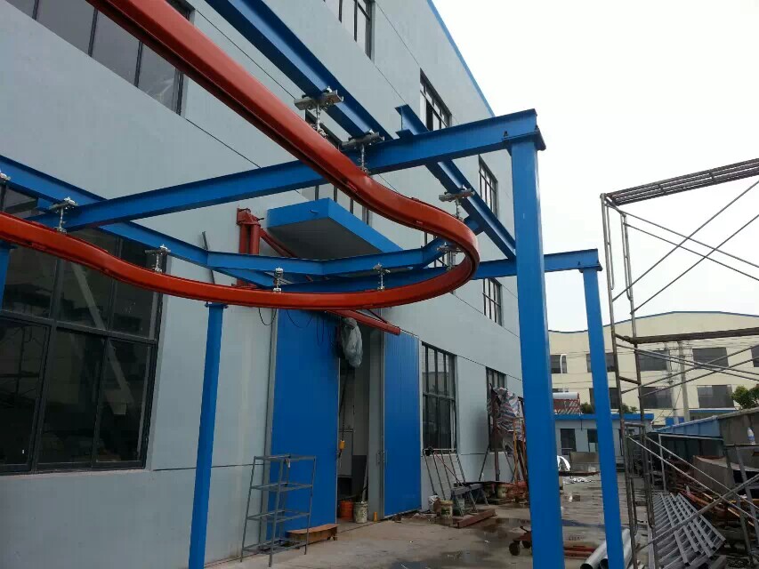 KBK軌道采用Ω形狀,2片焊接而成,常用的是KBKII型軌道,多根軌道可用高強度螺栓連接。彎軌的轉(zhuǎn)彎半徑1.5m,大彎可用直軌搭配。沒有更小半徑的,會對小車運行有影響。也可在KBKII型軌道內(nèi)側(cè)安裝內(nèi)置滑觸線,用于葫蘆供電,稱為KBKII-R型。