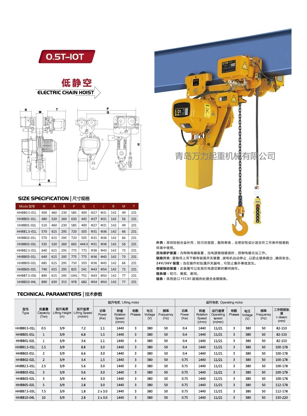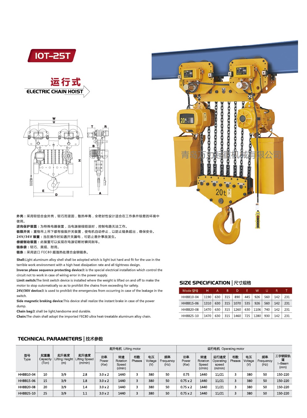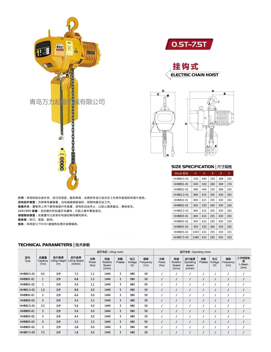 極限開關(guān):吊上吊下都有開關(guān)裝置,使自動停止,防止鏈條超出,確保安全。