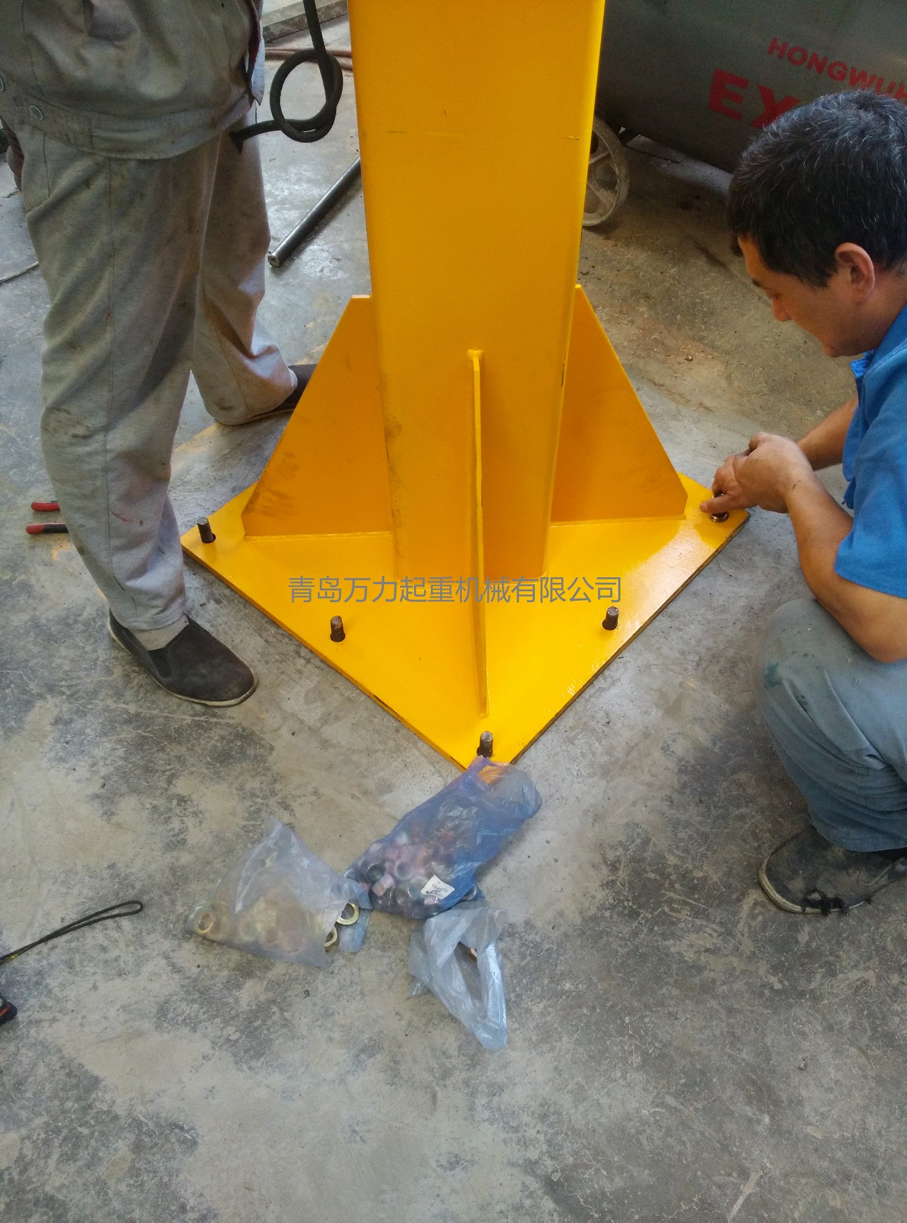 立柱式旋臂吊立桿選用方管或圓鋼管生產(chǎn)制造,兩邊分別電焊焊接底版和圓弧,上端安裝腰圈路軌。底版根據(jù)化學(xué)螺栓與水泥地面聯(lián)接固定不動(dòng),確保懸臂吊的可靠性。圓弧上打有形孔,建立電纜線(xiàn)從立桿內(nèi)部隱蔽工程裝線(xiàn)。